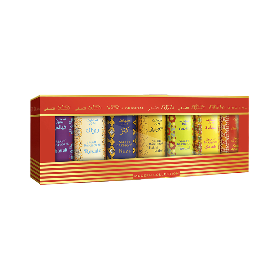 Contains: Smart Bakhoor Fakhar Al Nabeel 35g - 2 pcs Smart Bakhoor Sa'ada 35g - 2 pcs Smart Bakhoor Tawasul 35g - 2 pcs Smart Bakhoor Khayali 35g - 2 pcs Smart Bakhoor Habibi Lil Abad 35g - 2 pcs Smart Bakhoor Kanz 35g - 2 pcs Smart Bakhoor Royale 35g - 2 pcs